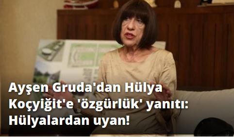 Sinema ve tiyatro sanatçısı Ayşen Gruda Posta'dan Oya Çınar'a verdiği röportajda Hülya Koçyiğit'e cevap verdi. Röportajında Hülya Koçyiğit'in, "Ülkede baskı yok, aksine herkes fazla özgür" ifadelerine değinen Gruda, "Daha ne yapsınlar pardon,kamçıyla mı dövsünler bizi? Hülya Hanım bu hülyalardan bir an evvel uyansın" dedi.
