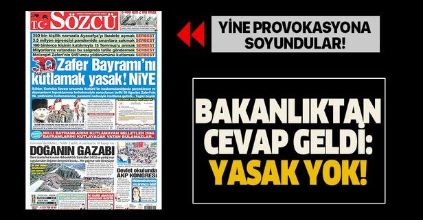 "Ulusal ve Resmi Bayramlar İle Mahalli Kurtuluş Günleri, Atatürk Günleri ve Tarihi Günlerde Yapılacak Tören ve Kutlamalar Yönetmeliği' hükümleri uyarınca icra edilen 30 Ağustos Zafer Bayramı kutlamaları ile ilgili Bakanlığımızca alınan yasaklama kararı bulunmamakta olup 19.08.2020 tarihli yazımızla yapılan düzenleme Covid 19 salgını ile mücadelede içerisinde bulunduğumuz kontrollü sosyal hayat süreci içerisinde alınması gereken tedbirlerin Valiliklere bildirilmesidir" denilen açıklamada, şu ifadelere yer verildi: