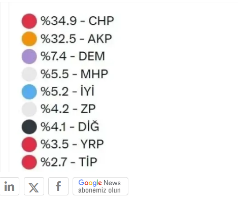 Anket sonuçlarına göre İstanbul’da CHP yüzde 34,9 ile birinci sırada yer alırken, AKP yüzde 32,5 ile ikinci oldu. Diğer partilerin oy oranları ise şu şekilde sıralandı:
