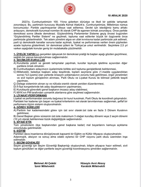 CHP İzmir Milletvekili Mehmet Ali Çelebi ve Karabük Milletvekili Hüseyin Avni Aksoy'un mektup yazarak, parti yönetimini eleştirmesini değerlendiren Kılıçdaroğlu, "Cumhuriyet Halk Partisinde genel başkana mektup yazılmaz arkadaşlar. Genel başkandan randevu alınır, gelinir konuşulur. Kim arzu ediyorsa telefonu açar, randevuyu ister, gelir otururuz konuşuruz. Sorunları varsa dinler, çözeriz. Onları kabul etmeyiz, doğru değil" diye konuştu.
