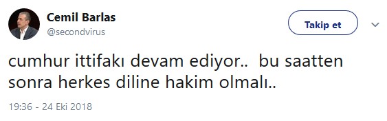 24 Ekim 17.08'de "CHP, HDP ile ittifak yapacak derken MHP, hem HDP hem İYİ Parti ile fiili ittifak yapmış oldu.. Dün dündür.." mesajı yazan Barlas, bundan 2 buçuk saat sonra, 19.36'da ise şu mesajı paylaştı:
