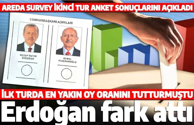 AREDA Survey, 14 Mayıs’ta yapılan ilk tur seçimlerinden hemen önce yayınladığı ankette şu sonuçları elde ettiğini duyurmuştu: Recep Tayyip Erdoğan: %51,3 Kemal Kılıçdaroğlu: %44,2 Sinan Oğan: %3,9 Muharrem İnce: %0,6