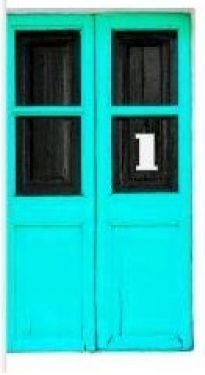 Turkuaz renkte, çift kanatlı, içeriyi ve dışarıyı görebildiğiniz bir kapı.