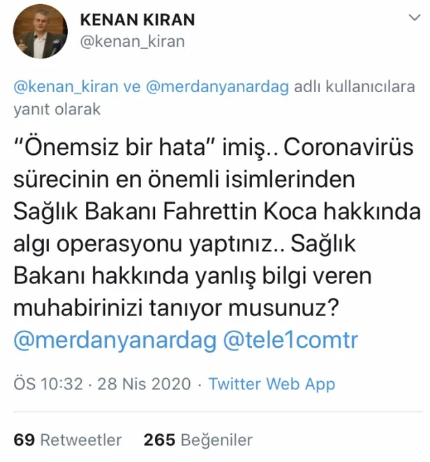Merdan Yanardağ; Tele-1 Televizyonu İsveç muhabiri Seda Şanlıer, Emrullah Gülüşken'in Konya Kulu Tavşançalı Köyü'nden olduğunu iddia ederek, "Tesadüftür ki, Sağlık Bakanı Fahrettin Koca da aynı memleketli. Aynı ilçe ve hatta aynı köylü oldukları belirtiliyor" şeklindeki gerçeğe aykırı açıklamaları hakkında açıklamada bulundu.