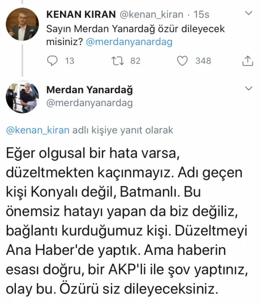 "Eğer olgusal bir hata varsa, düzeltmekten kaçınmayız. Adı geçen kişi Konyalı değil, Batmanlı. Bu önemsiz hatayı yapan da biz değiliz, bağlantı kurduğumuz kişi. Düzeltmeyi Ana Haber'de yaptık. Ama haberin esası doğru, bir AKP'li ile şov yaptınız, olay bu. Özürü siz dileyeceksiniz."