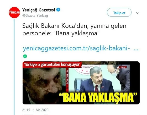 Dün gerçekleşen Bilim Kurulu toplantısının ardından önemli açıklamalarda bulunan Fahrettin Koca, sosyal mesafe kuralını aşarak kendisine fazla yaklaşan görevliyi "Bana yaklaşmayın" diye uyarmıştı. Koca'nın bu uyarısı sosyal medyada koronavirüs önlemlerine uyulması gerektiği kanısını oluşturmuş ve Koca tebrik edilmişti.