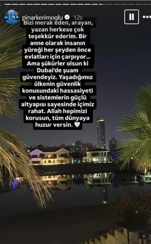 Kerimoğlu, ilk mesajında kendisini merak edenlere teşekkür ederek, “Bir anne olarak insanın yüreği her şeyden önce evlatları için çarpıyor. Şükürler olsun ki Dubai’de şu an güvendeyiz. Yaşadığımız ülkenin güvenlik konusundaki hassasiyeti ve güçlü altyapısı sayesinde içimiz rahat. Allah hepimizi korusun, tüm dünyaya huzur versin” ifadelerini kullandı.