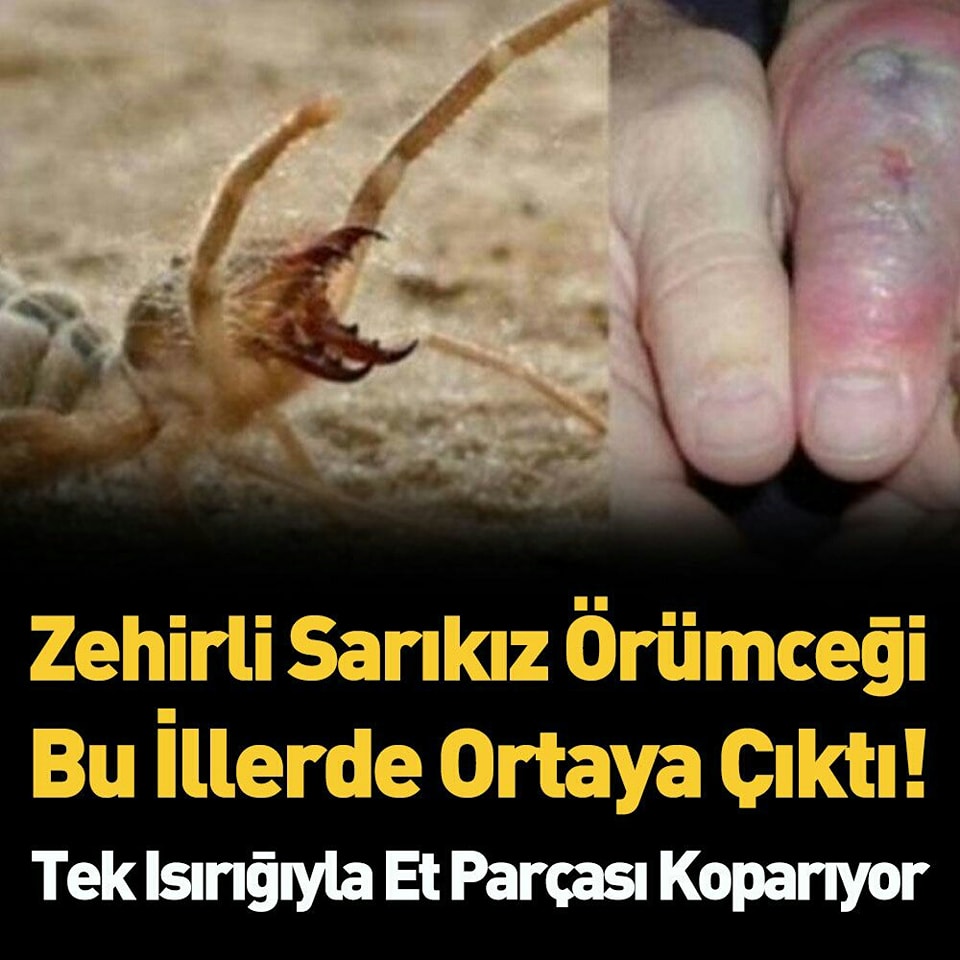 Derhal yardım çağırdı. Isırdığı yerden et pa*rçası ko*parıyor Kurugeçit Mahallesi’nin oyun parkında bulunan çocukların aileleri ze*hirli sarıkız örümceğini fark etti. Bilinen özellikleri sebebiyle çevreye k*orku saçan bu örümcek akrep bile avlayabiliyor. Zehirli sarıkız örümceğini gören yurttaşlar hemen yetkilileri arayıp haber verdi. Daha sonra olanlar içler acısı. İşte detaylar... Hızlı hareket ediyor Sarıkız veya deve örümceği olarak malum bu ze*hirli örümcekler çok hızlı hareket edebiliyor. Onlardan kaçmak çok zor. Eklem bacakları diğer örümceklerden ayrı olarak 5 çift bacağı olmasına karşın yalnızca 4 çift bacaklarını kullanıyorlar. Öndeki bacaklarını anten niyetine kullanıyorlar. Duyu organları ve avlanma Örümceklerin bacakları duyu organlarını üstlenmektedir. Örümcekler karanlıkta avlanır ve bacaklarında bulunan duyu organları yardımıyla avını görür. Kor*kunç görüntüsü Ko*rkutucu görüntüsü ve güçlü dişleri olmasına rağmen, te*hdit altında olmadıkları sürece kolay rahat insanlara saldırmazlar. Z*ehirli ve güçlüler Ze*hirli ve güçlü oldukları için insanoğluı k*orkutmaktadır ve örümceklere karşı fobisi olan insanoğlu yanına bile yaklaşamaz. Görmüş olduğunüz yerden uzaklaşın Ne kadar tehdit altında olmadan insanlara saldırmasa da, bu örümceği görmüş olduğunüz yerden uzaklaşın. Isırdığı vakalarda süre kaybetmeden doktora gidilmelidir. Sarıkız örümceği Z*ehirli sarıkız örümceği etoburdur. Kısaca akrepleri, böcekleri ve kemirgenleri yemektedirler. çoğunlukla çöl bölgesinde yaşar fakat bahçelerde ve ormanlarda da görülür. Isırıldıktan sonraki belirtiler Bu z*ehirli sarıkız örümceği tarafınca ısırıldığında mide bulantısı, baş dönmesi, halsizlik, ısırılan bölgede yanma ve uyuşukluk hissedilir. Bu örümceğin Kayseri, Adıyaman, Hakkari illerinde görüldüğü ortaya çıktı.