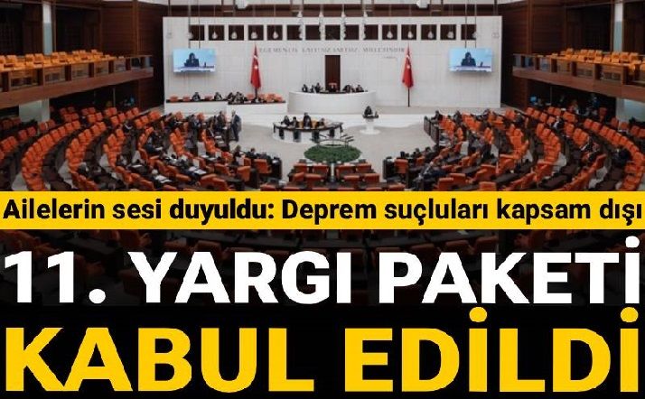 11. Yargı Paketi deprem suçluları kapsam dışında tutularak kabul edildi. Böylelikle depremlerde yıkılan binalardan ve ölümlerden sorumlu olanlar "erken tahliye" düzenlemesinden faydalanamayacak. 6 Şubat depremlerine ilişkin 2 bin 300 dava süreci bu değişiklikten etkilenebilecek.
