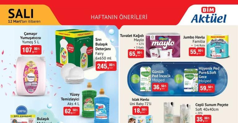 Bim Aktüel Salı kampanyalarında süt ve süt ürünleriyle başlayan fırsatlar temel tüketim ürünleri ve atıştırmalıklarda önemli avantajlı fiyatları sunuyor. İlk olarak İçim Yarım yağlı yoğurt 5 kg 139,50 TL’den satışa çıkıyor. İçim 3kg tam yağlı yoğurt ise 99 liradan satışa çıkacak. Pınar 750 g laktozsuz yoğurt 39,50 TL fiyatta ve pınar 200 ml %18 yağlı krema 24,50 tl fiyatla sizlerle olacak. Klasik inek peyniri Akpınar 500 g 115 liradan (9 ay olgunlaştırılmış) ve ayrıca pınar 7 üzerine gram az yağlı süzme peynir 115 tl fiyatlar satış listesine girecek. Pınar 1 lt %2 buçuk yağlı süt 33,50 tl fiyatla kaçırılmayacak bir fırsat olarak öne çıkarken pınar 6x200ml %3,3 yağlı süt 62,50 tl fiyatta raflarda olacak. Bu hafta pınar 1 lt laktozsuz süt 34,50 tl olarak, pınar 1 lt çocuk devam sütü 37,50 tl olarak raflara gelecek. Bim Aktüel listelerinde aromalı süt çeşitleri pınar kido altılı paket fiyatı 55 liradan sizlerle olacak. Süt ürünlerinde fırsatlar Bim Salı kataloğuyla sürecek. Lor peyniri 49 TL kilogram fiyatıyla raflara gelecek olup tam yağlı taze kaşar peyniri 1 kg 225 liradan ve yarım yağlı salamura peynir 450gr 67,50 TL fiyatıyla sizlerle olacak. Pınar 1 lt kefir 34,50 tl ve içim 1 lt orman meyveli kefir 44,50 tl fiyata sahip olarak satılacak. Bim 12 Mart 2024 kataloğunda pınar 700 g tereyağı 249 liradan, pınar 400 g labne 67,50 TL fiyatla ve eker tombul ayran altılı paket 32,50 TL olarak müşteri bekleyecek. Sek taze peynir çeşitleri 150 g 32,50 TL fiyatıyla ve yarım yağlı tost peyniri zinde 1 kg 175 tl fiyatıyla öne çıkacak. Bu hafta dondurulmuş bütün piliç ürünleri 62,50 tl fiyatıyla öne çıkarken piliç salam 49,50 TL, pirinç kokteyl sosis 65 tl, sade ilikli kemik suyu Gruvita 4x50ml 35 TL olarak satılacak. Acılı acısız dana kebap 150 g ise 42 tl fiyatıyla raflarda olacak. Avtivia 2x100g probiyotik yoğurt 22,50 TL olarak satılacak olup Quark çeşitleri 19,50 TL fiyatıyla yaban mersini, çilek ve incir ceviz seçeneklerine sahip olarak sek 140 g marka ve ağırlığa sahip olarak 19,50 tl adet fiyatını müşterisine sunacak.