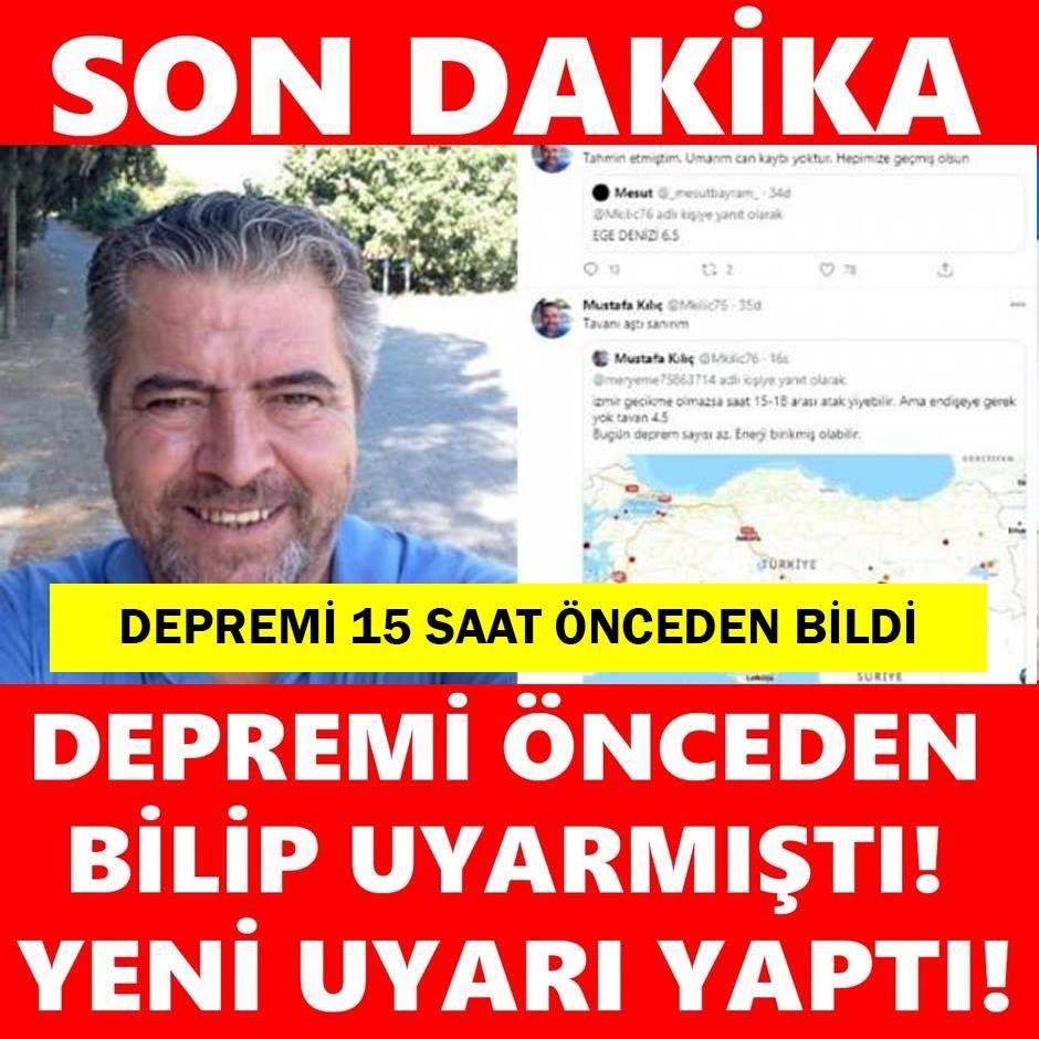 Mustafa Kılıç isimli vatandaş, İzmir’de meydana gelen 6,6 şiddetindeki depremi 15 saat önceden tahmin etti. Dün saat 11.30’da sosyal medyadan paylaşım yapan Kılıç, “İzmir gecikme olmazsa saat 1518 arası atak yiyebilir” uyarısı yapmış. Twitter’da kendisini Doğa Bilimcisi olarak tanıtan Mustafa Kılıç isimli bir vatandaş, İzmir’de meydana gelen 6,6 şiddetindeki depremi 15 saat önceden bildi.