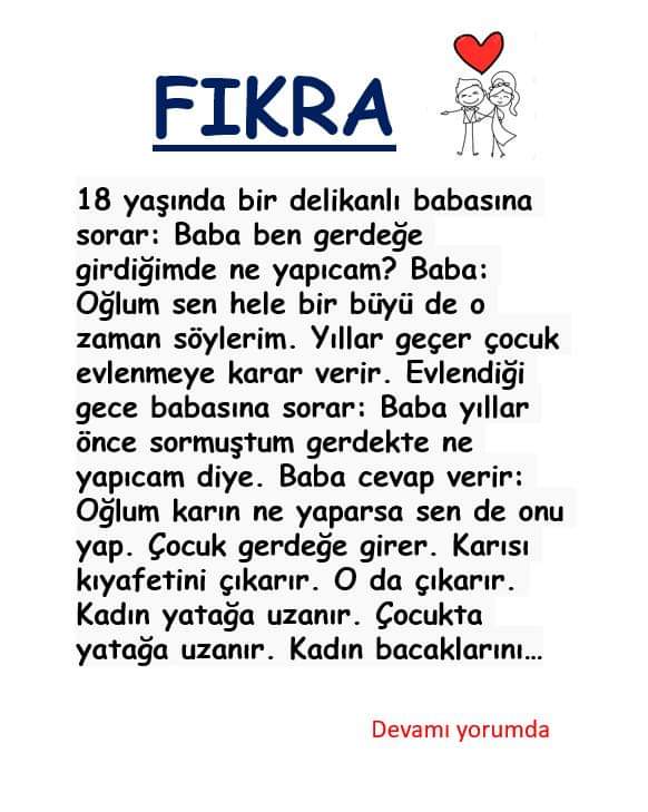 18 yaşında bir delikanlı babasına sorar: Baba ben gerdeğe girdiğimde ne yapıcam? Baba: Oğlum sen hele bir büyü de o zaman söylerim. Yıllar geçer çocuk evlenmeye karar verir. Evlendiği gece babasına sorar: Baba yıllar önce sormuştum gerdekte ne yapıcam diye. Baba cevap verir: Oğlum karın ne yaparsa sen de onu yap. Çocuk gerdeğe girer. Karısı kıyafetini çıkarır. O da çıkarır. Kadın yatağa uzanır. Çocukta yatağa uzanır. Kadın bacaklarını…