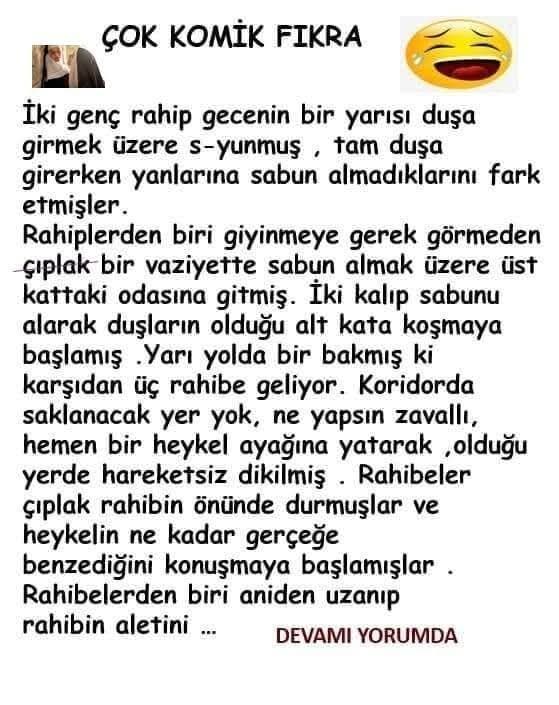 İki genç rahip gecenin bir yarısı duşa girmek üzere s-yunmuşlar, tam duşa girerken yanlarına sabun almadıklarını fark etmişler. Rahiplerden biri giyinmeye gerek görmeden çıplak bir vaziyette sabun almak üzere üst kattaki odasına gitmiş. İki kalıp sabunu alarak duşların varolduğu alt kata koşmaya başlamış. Yarı yolda bir bakmış ki karşıdan üç rahibe geliyor. Koridorda saklanacak yer yok, ne yapsın zavallı, hemen bir heykel ayağına yatarak, varolduğu yerde hareket etmeyen dikilmiş. Rahibeler çıpl*k rahibin önünde durmuşlar ve heykelin ne kadar gerçeğe benzediğini konuşmaya başlamışlar. Rahibelerden biri aniden uzanıp rahibin aletini …