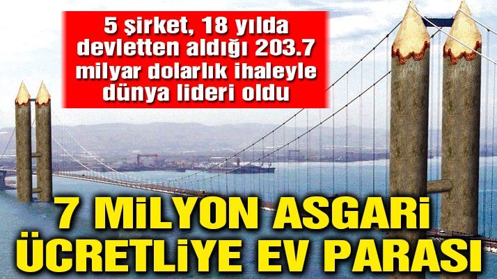 Kamu ihaleleriyle zengin olan 5 şirketin 18 yılda devletten aldığı ihalelerin toplam büyüklüğü 203.7 milyar doları buluyor. Bugünkü kurla yaklaşık 1 trilyon 556 milyar TL gibi olağanüstü büyüklüğü ifade eden bu devasa para, Türkiye'de ciddi geçim zorluğu yaşayan 7 milyon asgari ücretlinin 8 yıllık maaşına karşılık geliyor.