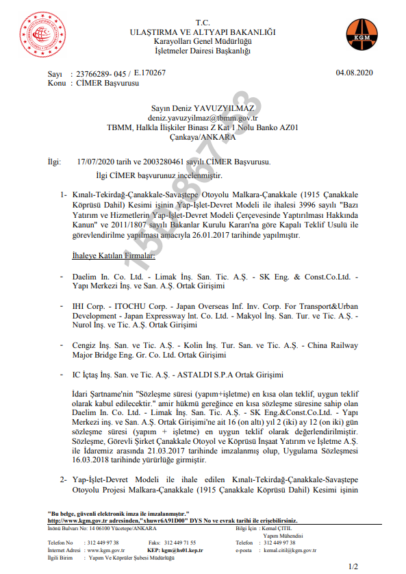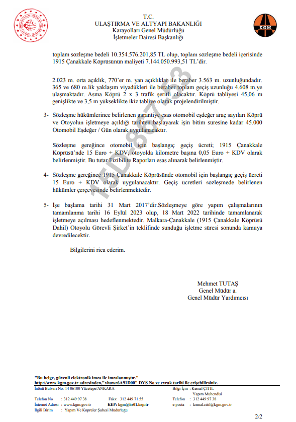 "Şirket köprünün maliyetini yaklaşık 3 yılda çıkarıyor. Sözleşmedeki birim fiyatlarla hesaplandığında her yıl şirketin kasasına 2 milyar 173 milyon TL girecek. Sözleşmenin süresi ise 16 yıl 2 ay olarak belirlenmiş. Köprü, Karayolları'na devredilene kadar geçecek olan sürede şirketin kasasına girecek olan parayla en az 3 tane 1915 Çanakkale Köprüsü yapmak mümkün"
