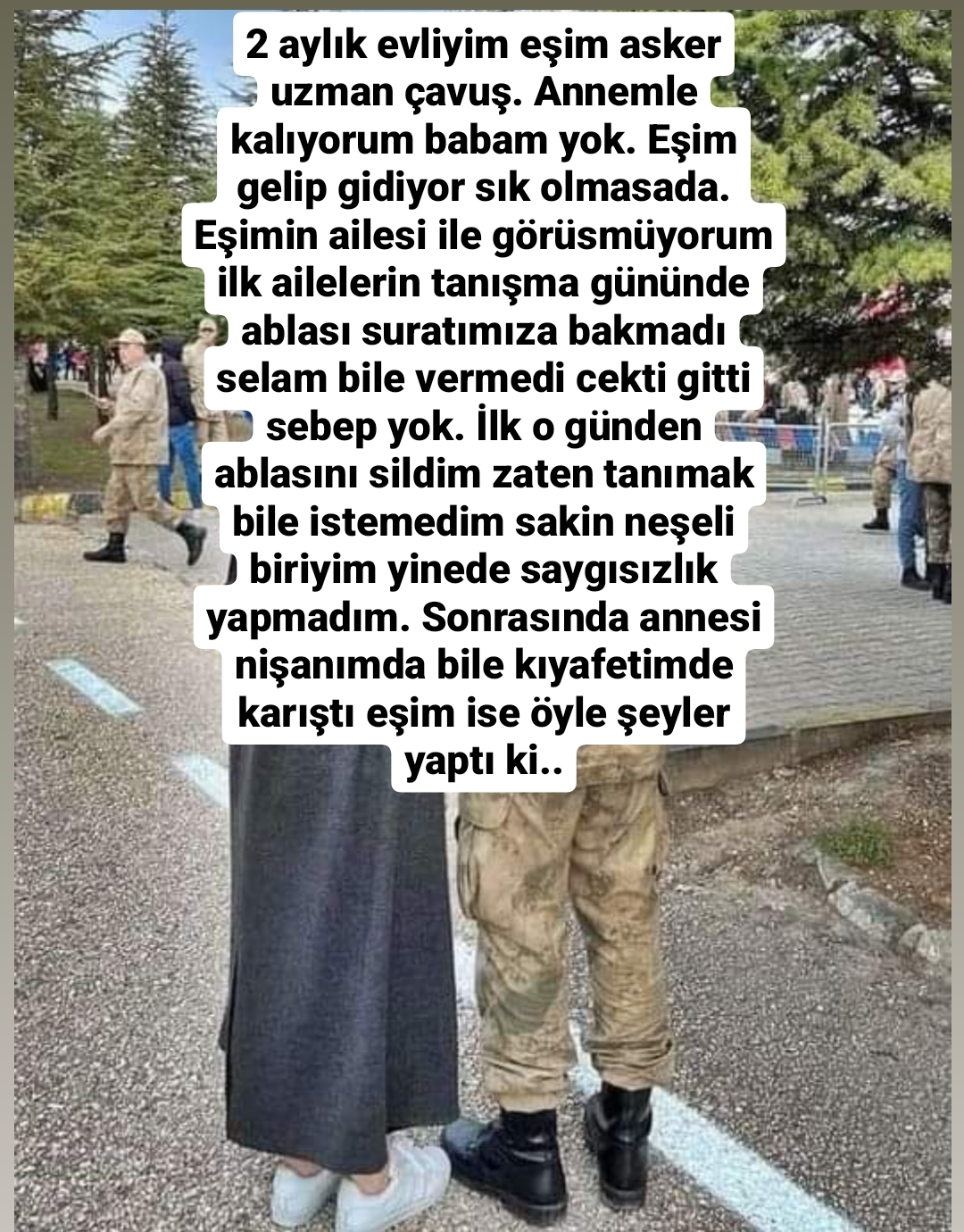 2 aylık evliyim eşim asker uzman çavuş. Annemle kalıyorum babam yok. Eşim gelip gidiyor sık olmasada. Eşimin ailesi ile görüsmüyorum ilk ailelerin tanışma gününde ablası suratımıza bakmadı selam bile vermedi cekti gitti sebep yok. İlk o günden ablasını sildim zaten tanımak bile istemedim sakin neşeli biriyim yinede saygısızlık yapmadım. Sonrasında annesi nişanımda bile kıyafetimde karıştı eşim ise öyle şeyler yaptı ki.. HABERİN DEVAMI İÇİN GÖRSELE DOKUNUNUZ….
