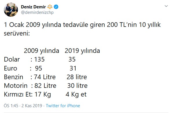 CHP Genel Başkanı Kemal Kılıçdaroğlu’nun danışmanı Deniz Demir, 1 Ocak 2009 yılında tedavüle giren 200 TL’lik banknotların 10 yıldaki değer kaybedilişini yazdı.