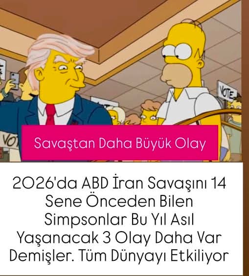 2026'da Savaştan daha büyük Yaşanacak 3 olay YOR-UMDADünyaca ünlü animasyon dizisi The Simpsons, geçmişte bazı olayları önceden tahmin ettiği iddialarıyla sık sık gündeme geliyor. Son günlerde ise dizinin 2026 yılına ilişkin “tahminleri” sosyal medyada yeniden konuşulmaya başlandı. Peki Simpsonlar’a göre 2026’da neler olacak? İşte dizinin 2026 tahminlerinde öne çıkan başlıklar…Diğer sayfayamıza geçerek öğreninDünyaca ünlü animasyon dizisi The Simpsons, geçmişte bazı olayları önceden tahmin ettiği iddialarıyla sık sık gündeme geliyor. Son günlerde ise dizinin 2026 yılına ilişkin “tahminleri” sosyal medyada yeniden konuşulmaya başlandı. Peki Simpsonlar’a göre 2026’da neler olacak? İşte dizinin 2026 tahminlerinde öne çıkan başlıklar…Diğer sayfayamıza geçerek öğrenin