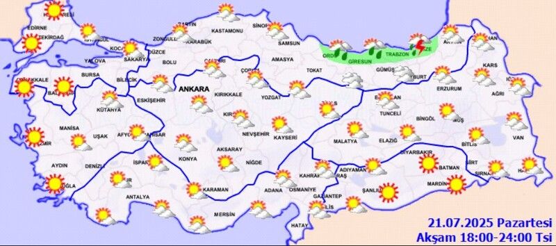 Meteoroloji, 21 Temmuz hava durumu raporunu yayımladı. Türkiye genelinde Afrika sıcağı etkisini arttırırken sıcaklıklar yer yer 45 dereceyi aşacak. Rapora göre; Artvin, Ordu, Trabzon, Erzurum, Kars, Giresun, Rize ve Ardahan sağanak ve gök gürültülü sağanak bekleniyor.