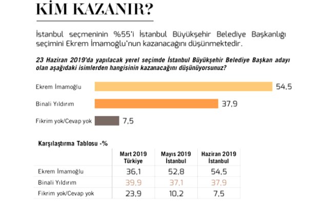 KONDA, 1516 Haziran 2019 tarihlerinde İstanbul Büyükşehir Belediyesi sınırları içindeki 157 mahallede 3498 kişiyle hanelerinde yüz yüze görüşülme ile gerçekleştirilen 24 Haziran İsranbul seçimi anketinin sonuçlarını açıklamıştı. KONDA anketinde Ekrem İmamoğlu yüzde 49 gösterilirken Binali Yıldırım ise 40.9 olarak araştırmaya yansımıştı. Ankete göre kararsız veya oy kullanmayacak seçmenin oranı da 9,4 olarak ölçülmüştü.