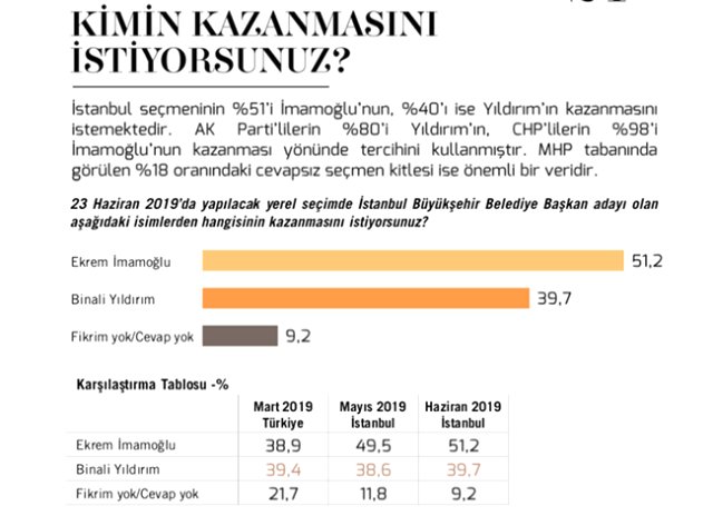 Yüzde 9,4 kararsız veya oy kullanmayacak seçmeni orantılı bir şekilde dağıtıldığında ise Ekrem İmamoğlu'nun yüzde 54, Binali Yıldırım'ın yüzde 45 oy oranına ulaşacakları hesaplanmıştı.