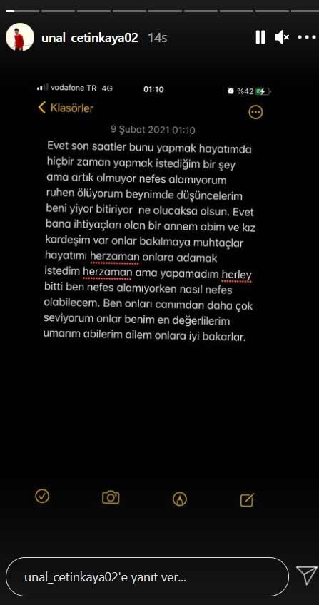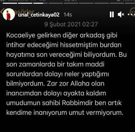 Çetinkaya, bıraktığı intihar notunda, "Evet son saatler bunu yapmak hayatımda hiçbir zaman yapmak istediğim bir şey ama artık olmuyor, nefes alamıyorum, ruhen ölüyorum, beynimde düşüncelerim beni yiyip bitiriyor. Kocaeli'ye gelirken diğer arkadaşlar gibi intihar edeceğimi edeceğimi hissetmiştim burada hayatıma son vereceğimi biliyordum. Son zamanlarda maddi sorunlardan dolayı neler yaptığımı bilmiyordum. Kadınlara lütfen saygı gösterin, incitmeyin, şiddet uygulamayın, konuşmayı deneyin ön yargılı olmayın, affetmeyi bilin. Sizleri seviyorum, Hoşça kalın" ifadelerini kullandı.