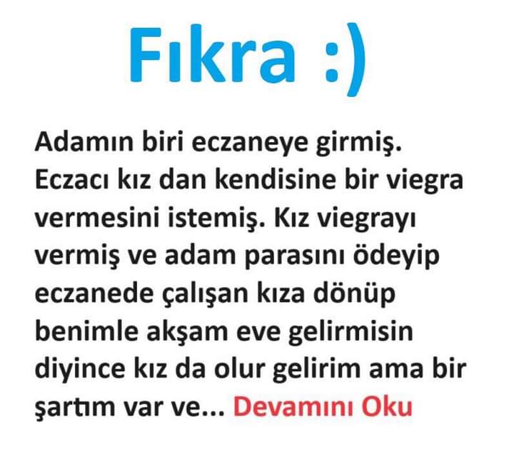 Adamın biri eczaneye girmiş. Eczacı bayandan kendisine bir vie.gra vermesini istemiş. Kadın vie.gra vermiş ve adam parasını ödeyip vie.gra yı..aldıktan sonra yere atmış ve paketin üzerinde zıplayıp, çiğnemiş. Bunu gören eczacı bayan niye yaptığını sormuş. Adam cevaplamış -Sigarayı da yıllar önce böyle bırakmıştım…