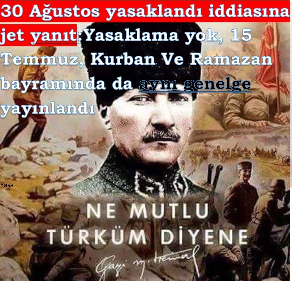 Bazı basın yayın organlarınca yapılan “İçişleri Bakanlığınca 30 Ağustos Zafer Bayramı Kutlamalarının Yasaklandığı” iddiasına yönelik kamuoyunun doğru bilgilendirilmesi amacıyla aşağıdaki açıklamaların yapılması zaruriyeti ortaya çıkmıştır;