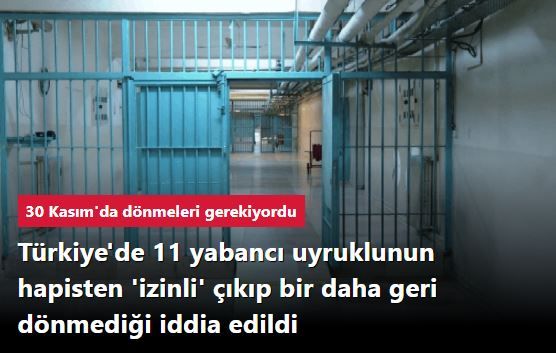 Yeniçağ’dan Fatih Savuk’un haberine göre, aralarında Afganistanlı, Pakistanlı, Suriyeli ve Faslıların olduğu yabancı uyruklu 11 hükümlü, izinli olarak dışarıya çıktı ancak 30 Kasım’da sürenin dolmasına rağmen halen geri dönmedi. Şahısların Türkiye’de aranmaya devam ettiği bildirildi.