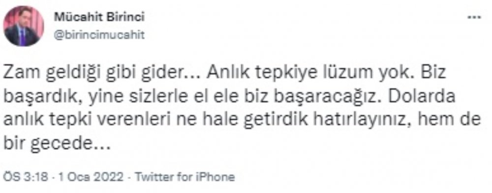 Birinci, konuya ilişkin Twitter üzerinden yaptığı paylaşımda "Zam geldiği gibi gider... Anlık tepkiye lüzum yok. Biz başardık, yine sizlerle el ele biz başaracağız. Dolarda anlık tepki verenleri ne hale getirdik hatırlayınız, hem de bir gecede..." ifadelerini kullandı.