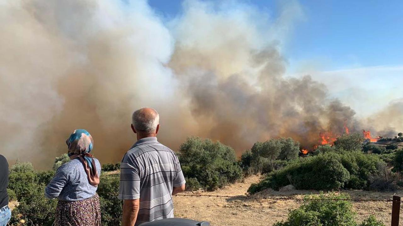 İhbar üzerine bölgeye İzmir Orman Bölge Müdürlüğüne ait 8 uçak, 17 helikopter, 22 arazöz, 7 su ikmal aracı ile 5 dozer sevk edildi.