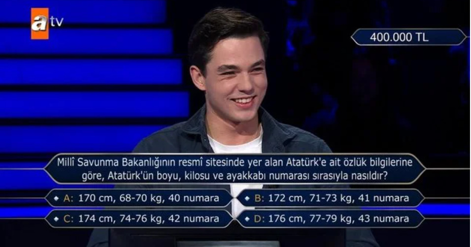 1 milyon TL’lik 12. bozukluğun anında evvel sorulan 400 bin liralık 11. soruda, ” Milli Savunma Bakanlığı’nın resmi sitesinde yer alan Atatürk’e ait özlük verilerine göre, Atatürk’ün boyu, kilosu ve ayakkabı numarası sırayla nasıldı?” denildi.Sorunun şıkları ise şu şekilde sıralandı: A- 170 cm, 68-70 kg, 40 numara B- 172 cm, 71-73 kg, 41 numara C- 174 cm, 74-76 kg, 42 numara (CEVAP) D- 176 cm, 77-79 kg, 43 numara SON SORUYU AÇTIRDI Soruya doğru cevap veren Alıcı, 1 milyon TL’lik 12. soruyu açtırdı. Fakat tam bu sırada zilin çalması ile uygulamanın sonuna gelindi.