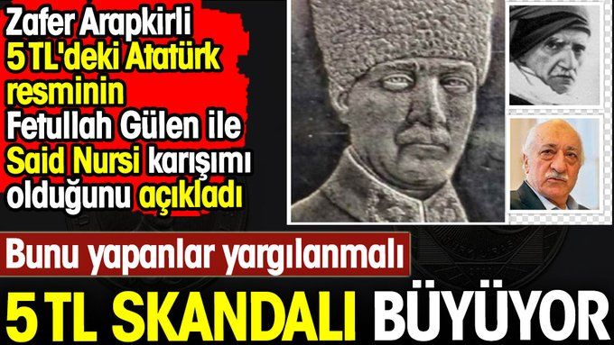 Gazeteci Zafer Arapkirli de sosyal medya hesabından konuyla ilgili bir paylaşımda bulundu. Arapkirli 5 TL'deki Atatürk resminin Fetullah Gülen ile Said Nursi karşımı olduğunu yazdı.