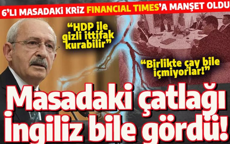 İngiltere'nin saygın gazetelerinden Financial Times (FT), 6'lı masa görüşmelerinde yaşanan belirsizlik ve çatışmayı, "Erdoğan'ın karşısındaki Türk muhalefeti, kendi içindeki görüş ayrılıkları ile savaşıyor" ifadeleriyle manşetine taşıdı.