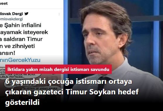 İktidara yakınlığıyla bilinen ve provokatif, cinsiyetçi ve ayrımcı çizimleriyle gündeme gelen mizah dergisi Misvak, İsmailağa Cemaati’ne bağlı Hiranur Vakfı’nın kurucusu Yusuf Ziya Gümüşel’in kızı H.K.G.'nin 6 yaşında imam nikâhı ile evlendirilmesi ve cinsel istismara maruz bırakılmasıyla ilgili iddiaları yazan gazeteci Timur Soykan hedef gösterdi.