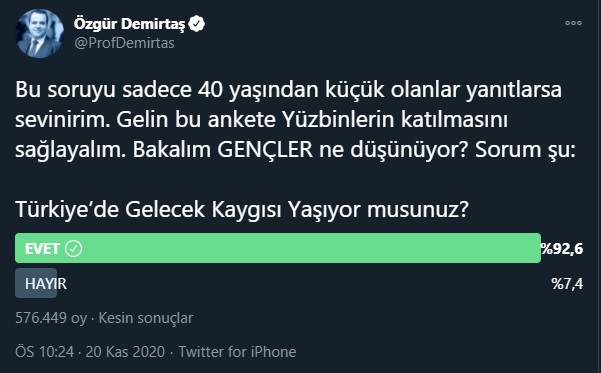 "Bu soruyu sadece 40 yaşından küçük olanlar yanıtlarsa sevinirim. Gelin bu ankete Yüzbinlerin katılmasını sağlayalım. Bakalım GENÇLER ne düşünüyor?" diyen Özgür Demirtaş, 24 saatlik bir anket başlattı.