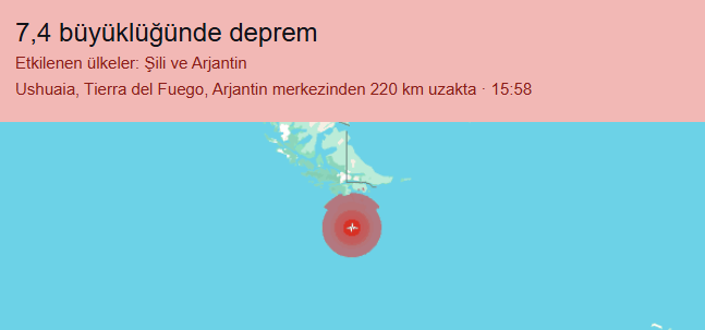 Arjantin'in güneyinde 7.4 büyüklüğünde deprem meydana geldi. Aynı bölgede 7.4'lük depremin ardından 7.1 büyüklüğünde bir sarsıntı daha meydana geldi.TSUNAMİ UYARISI YAPILDIArjantin'in en güneydeki şehri Ushuaia'de meydana gelen depremin ardından tsunami uyarısı yapıldı. Yapılan uyarıda, halka kıyıdan uzaklaşmaları ve daha yüksek mevkilere gitmeleri belirtildi.