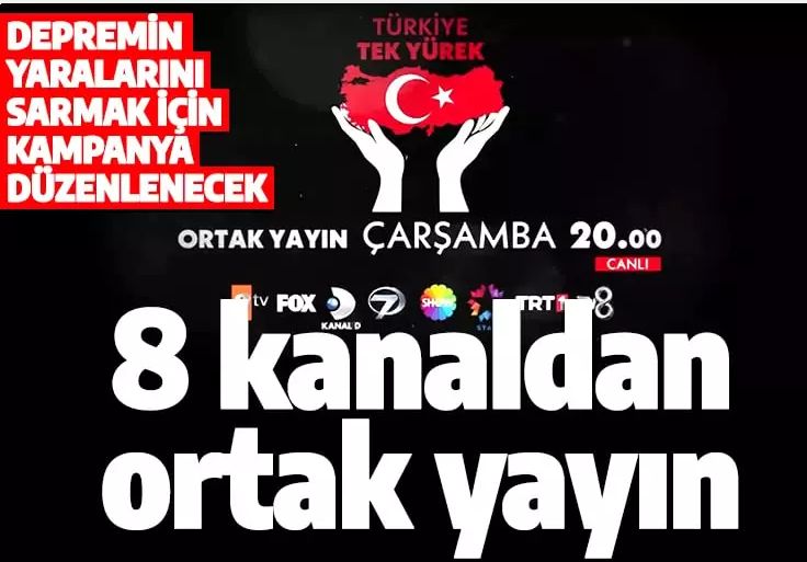 Türkiye'nin yüreğinde derin yaralar açan, son yüzyılın en büyük deprem felaketinin yaşandığı bu günlerde Türkiye'nin en çok izlenen 8 ulusal TV kanalı yardım için ortak yayında bir araya gelecek.