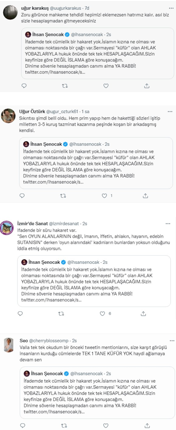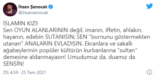Şenocak'ın paylaşımı şu şekilde: "İslamın kızı! Sen oyun alanlarının değil, imanın, iffetin, ahlakın, hayanın, edebin sutanısın; sen 'burnunu göstermekten utanan' anaların evladısın. Ekranlara ve sakallı ağabeylerinin popüler kültürün kurbanlarına 'sultan' demesine aldanmayasın! Umudumuz da, duamız da sensin!"