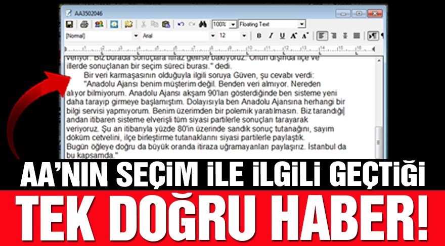 “Bir veri karmaşasının olduğuyla ilgili soruya Güven, şu cevabı verdi: “Anadolu Ajansı benim müşterim değil. Benden veri almıyor. Nereden alıyor bilmiyorum. Anadolu Ajansı akşam 90’ları gösterdiğinde ben sisteme yeni daha tarayıp girmeye başlamıştım. Dolayısıyla ben Anadolu Ajansına herhangi bir bilgi servisi yapmıyorum. Benim üzerimden bir polemik yaratılmasın. Biz tarandığı andan itibaren sisteme elverişli tüm siyasi partilerle sonuçları tarayarak veriyoruz. Şu an itibarıyla yüzde 80’in üzerinde sandık sonuç tutanağını, sayım döküm cetvelini, ilçe birleştirme tutanaklarını siyasi partilerle paylaştık. Bugün öğleye doğru da büyük oranda itiraza uğramayanları paylaşırız. İstanbul da bu kapsamda.”