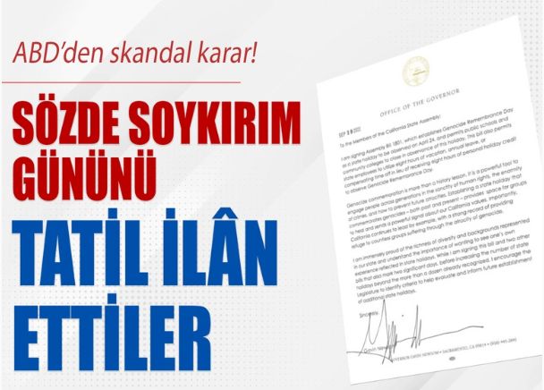 Meclis üyesi Adrin Nazaryan tarafından getirilen yasa (AB 1801), her yıl 24 Nisan'da Kaliforniya'daki tüm topluluk kolejlerinin ve devlet okullarının kapanmasını zorunlu kılıyor. Aynı gün devlet memurlarına ise ücretli izin verilecek. Nazaryan açıklamasında “Yasama Meclisi, Soykırımı Anma Günü'nün herkesin geçmiş ve şimdiki soykırımları, özellikle de bu vahşetlerin etkisini hissedenlerin üzerinde düşünmesi için bir gün olacağını tespit eder ve beyan eder” ifadelerini kullandı. Ayrıca yasama metninde sözde Ermeni Soykırımı ile ilgili “Eyalet Eğitim Kurulu, Soykırım'ı Anma Günü ile ilgili çalışmalar için devlet okullarında kullanılmak üzere bir model müfredat rehberi benimseyebilir." ifadesi yer aldı