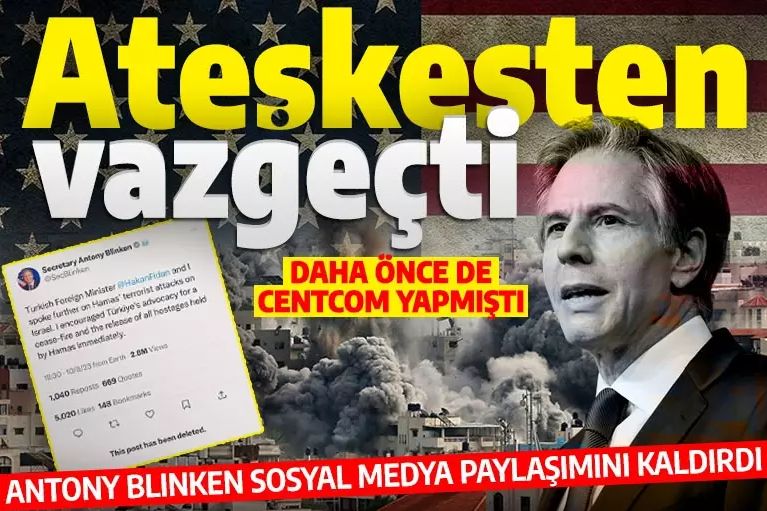 ABD Dışişleri Bakanı Antony Blinken, Dışişleri Bakanı Hakan Fidan'la görüşmesinin ardından sosyal medya hesabından "Türkiye'nin ateşkes çağrısını teşvik ettim" ifadelerini kullanmıştı. Blinken bu ifadelere yer verdiği sosyal medya mesajını sildi.