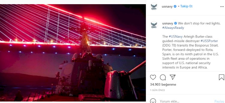 28 Ocak Perşembe günü Ukrayna'da yapılacak tatbikata katılmak için İstanbul Boğazı'ndan Karadeniz'e çıkan USS Porter (DDG78) muhribi, kırmızı ışıkla süslenen Yavuz Sultan Selim Köprüsü (Üçüncü Köprü) altından geçti. O anlara ait fotoğrafı paylaşan ABD Deniz Kuvvetleri'nin resmi instagram hesabı "Biz kırmızı ışıkta durmayız, her zaman hazır" mesajı yayınladı.