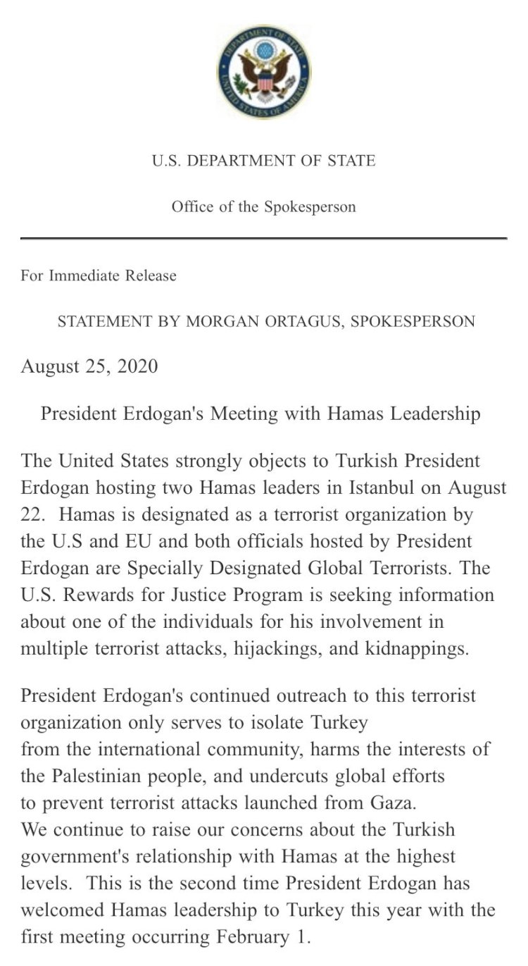 ABD Dışişleri Bakanlığı, Cumhurbaşkanı Erdoğan’ın Hamas yetkilileri ile yaptığı görüşmeyi hedef aldı. Görüşmeyi kınayan bakanlıktan yapılan açıklamada “Erdoğan’ın teröristlerle görüşmeye devam etmesi sadece Türkiye’nin uluslararası toplumdan izole edilmesine hizmet eder" denildi.