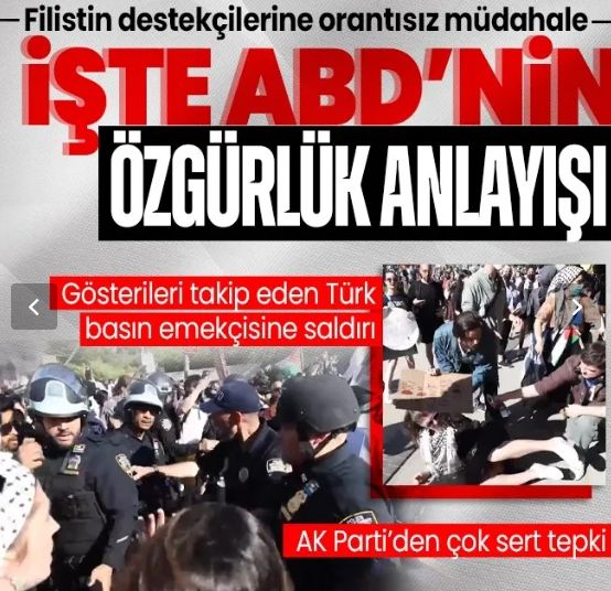 İLETİŞİM BAŞKANI FAHRETTİN ALTUNDAN TEPKİCumhurbaşkanlığı İletişim Başkanı Fahrettin Altun, Filistin'e destek gösterilerini takip eden AA foto muhabiri Fatih Aktaş'ın New York Polisinin (NYPD) sert müdahalesine maruz kalmasına ilişkin, "Basın özgürlüğü, demokrasinin bel kemiğidir. Adaletsizliğe, haksızlığa karşı mücadele veren tüm hakikatperver gazetecilerin yanında olmaya devam edeceğiz." ifadesini kullandı.