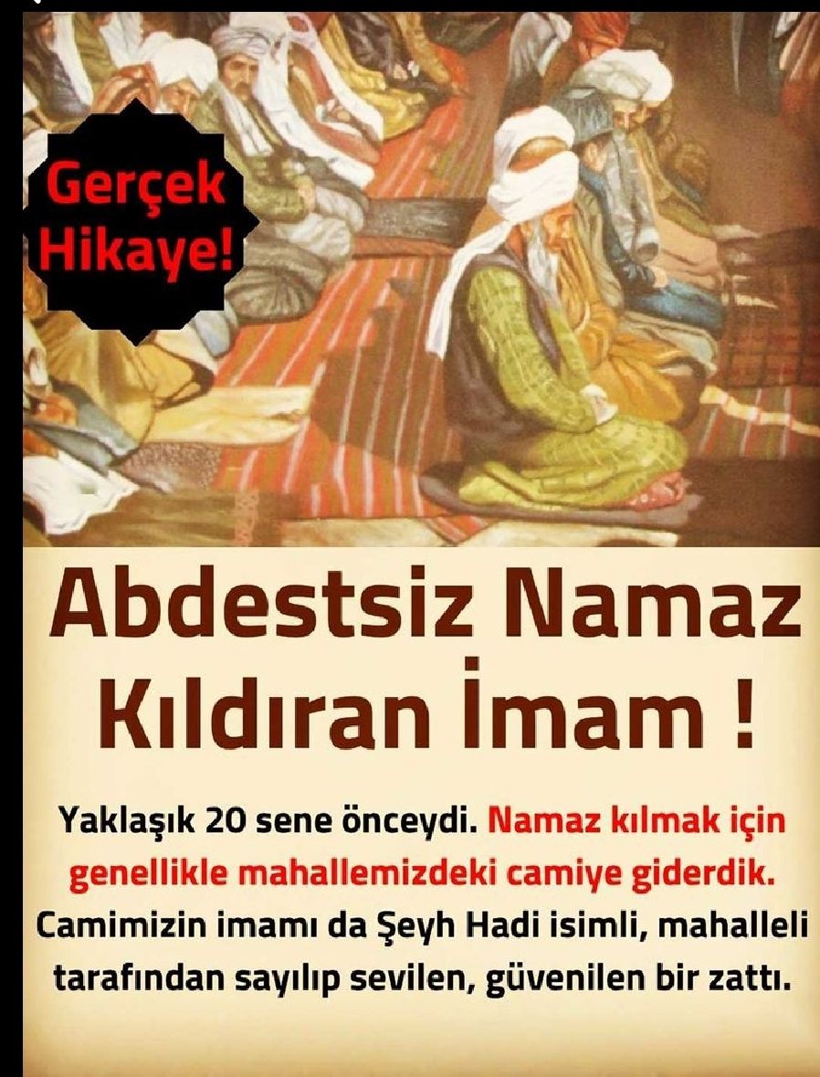 Yaklaşık 20 sene önceydi. Namaz kılmak için genellikle mahallemizdeki camiye giderdik. Camiimizin imamı da Şeyh Hadi isimli, mahalleli tarafından sayılıp sevilen,güvenilen bir zattı. Günlerden bir gün akşam namazı kılmak üzere camiye biraz erken gitmiştim abdest almak için aşagı kattaki abdesthaneye indim tuvaletlerin boşalmasını beklerken kapılardan biri açıldı imam Şeyh Sadi dışarı çıktı. Selamlaşıp hal hatır sorduktan sonra hocaefendinin Abdest almadan yukarı çıktıgını fark ettim. Çok şaşırmıştım. Başka da abdest alacak yer olmadıgına göre hoca nerede abdest alacak diye merak ederek peşini takib ettim hayretle hocanın abdest almadan direk camiye girip mihraba yöneldigini gördüm. Ezan ve kameti okuyup namaz kıldırmaya başladı ve arkasında saf tutanlar da ona uyarak tekbir getirip saf bağladılar.