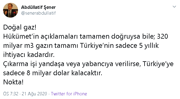 "Doğal gaz! Hükümet’in açıklamaları tamamen doğruysa bile; 320 milyar m3 gazın tamamı Türkiye’nin sadece 5 yıllık ihtiyacı kadardır. Çıkarma işi yandaşa veya yabancıya verilirse, Türkiye’ye sadece 8 milyar dolar kalacaktır. Nokta!"