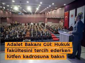 Hukuk fakültelerine girişte 190 bin olan başarı puanının 125 bine çekildiğini anımsatan Gül, "Biz, 'daha yukarıya' çekilsin dedik ama bu sene meyvesini alacağız. Bunun takibini yapacağız, başarı çıtasını daha da yukarıya çıkarmayı hepimiz hedefliyoruz. Hukuk fakültesine gittiğinde o okulda bir tane profesör, 8 tane yeni akademi dünyasına katılmış meslektaşımızın olduğu bir yerde hukuk fakültesi tabelasının asılması, o tabelanın altından geçmek gerçekten bizim için üzücüdür. Genç arkadaşlarıma söylüyorum, hukuk fakültesi tercih ederken lütfen kadrosuna bakın, dersinize giren kişilerin hukukçu mu değil mi, kaç tane profesör, doçent var, buna bakarak tercih edin. Bir hukukçu ağabeyiniz olarak tavsiye ediyorum. Bu sene üniversite sınavlarında daha nitelikli, daha kaliteli bir tercihi görmeyi hep birlikte umut ediyoruz" ifadelerini kullandı.
