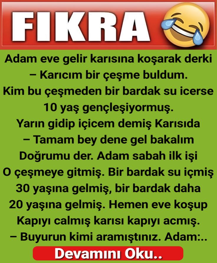Adam eve gelir karısına koşarak derki – Karıcım bir çeşme buldum. Kim bu çeşmeden bir bardak su icerse 10 yaş gençleşiyormuş. Yarın gidip içicem demiş Karısıda – Tamam bey dene gel bakalım dogrumu der. Adam sabah ilk işi oçeşmeye gitmiş. Bir bardak su içmiş 30 yaşına gelmiş bir bardak daha 20 yaşına gelmiş.Hemen eve koşup kapıyı calmış karısı kapıyı acmış.