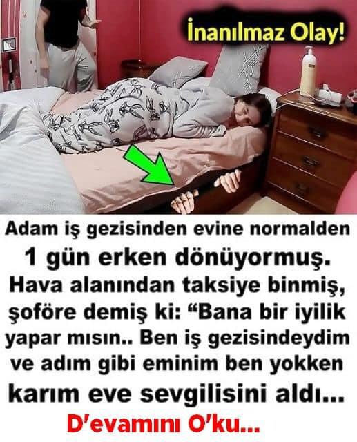 Adam iş gezisinden evine normalden 1 gün erken donüyormuş. Hava alanından taksiye binmiş, şoföre demiş ki: “Bana bir iyilik yapar mısın.. Ben iş gezisindeydim ve adım gibi eminim ben yokken k'arım eve sevgilisini aldı… Şimdi eve gidelim ikisi kesin şu an birlikteler...